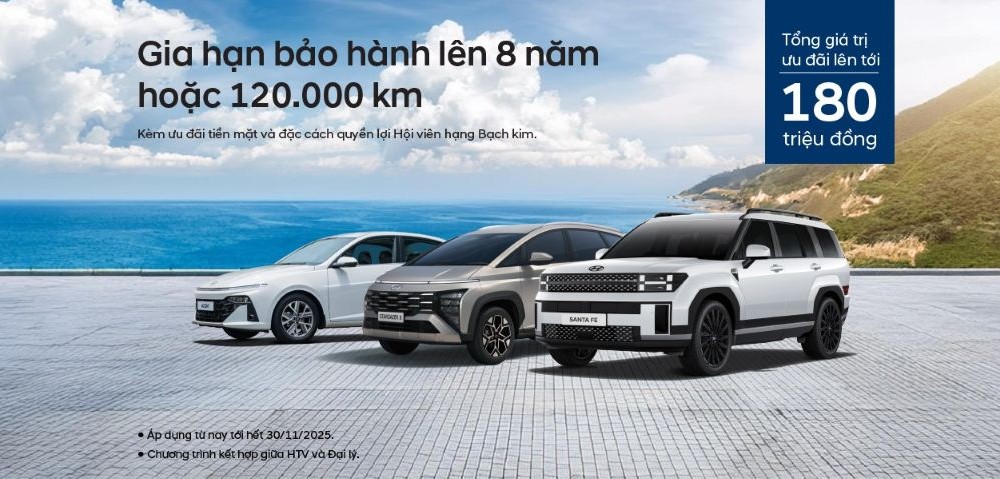 Hà Nội - Tháng 11/2025, Liên doanh ô tô Hyundai Thành Công Việt Nam (HTV) chính thức triển khai chương trình ưu đãi kép hấp dẫn “Bảo hành 8 năm – An tâm vận hành” cùng nhiều hỗ trợ chi phí sở hữu khác cho các mẫu xe Palisade, Santa Fe, Tucson, Creta, Accent, Stargazer và Grand i10.